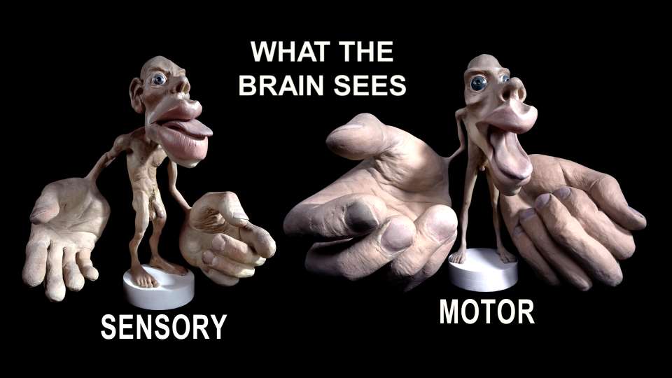 面積が広いという事は、触覚の場合はその身体部位に感覚のセンサーが多く分布している、単純化して言えば “敏感である” という事であり、運動の場合は、より細かい精緻な運動ができるように神経が密に分布している、という事を意味する。